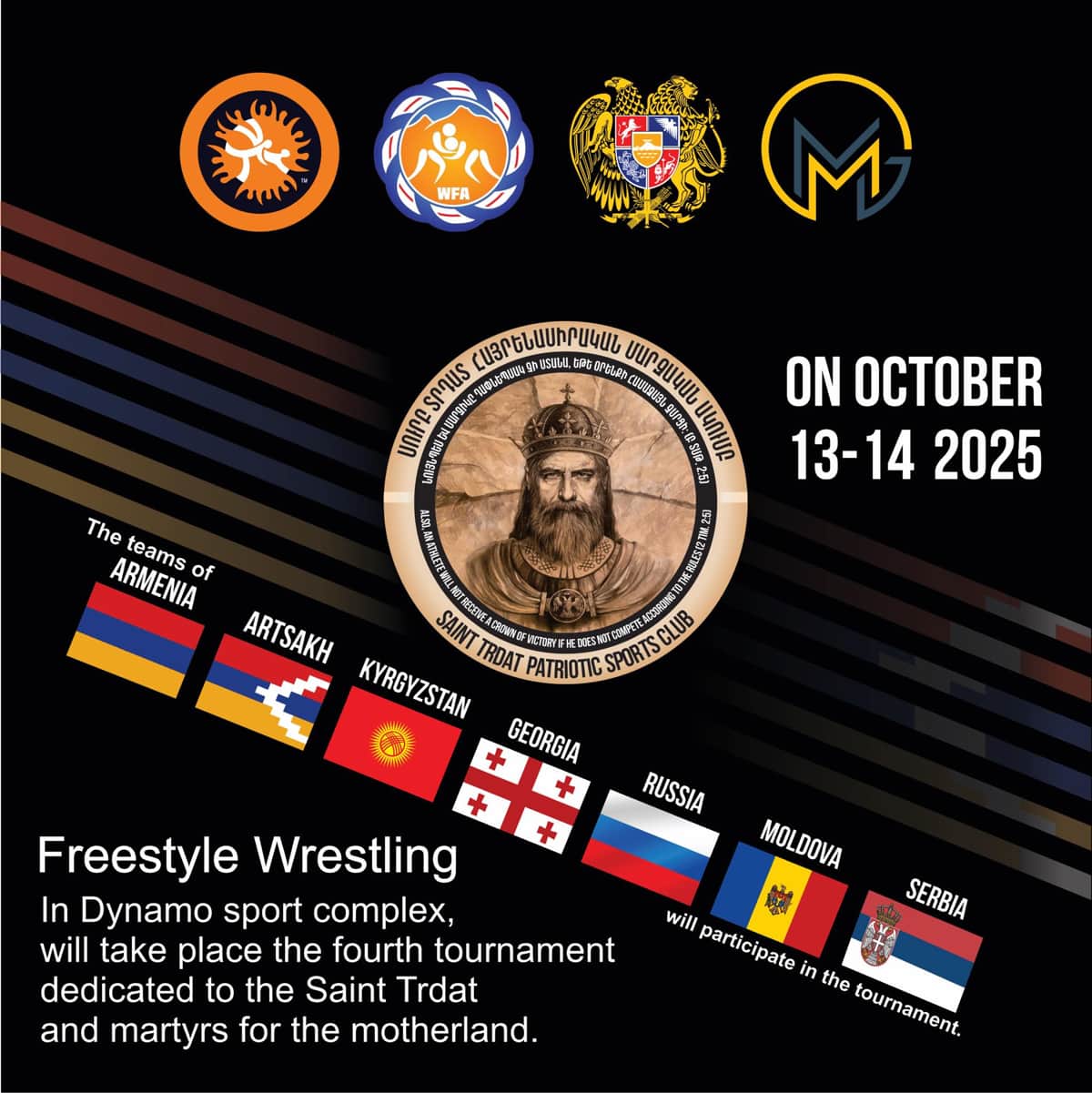 13-14 oktyabrda “Müqəddəs Trdat” vətənpərvər idman klubu “Marko Qrup” MMC və Ermənistan güləş federasiyası ilə birgə İrəvanda “Dinamo” idman sarayında müqəddəs Trdat və vətən uğrunda canından keçənlərə həsr olunmuş 4-cü beynəlxalq güləş turniri təşkil edib. Allsport.az saytının məlumatına görə, “Müqəddəs Trdat” idman klubunun rəsmi sosial hesabında yarışın elanında belə yazılıb. Tədbirdə ev sahibi ilə yanaşı, Qırğızıstan, Gürcüstan, Rusiya, Moldova və Serbiyadan olan idmançılar iştirak edib. Turnirin anonsunda bu ölkənin bayraqları ilə bərabər, qondarma “Ərsak”ın əski parçası da dürtüşdürülüb.