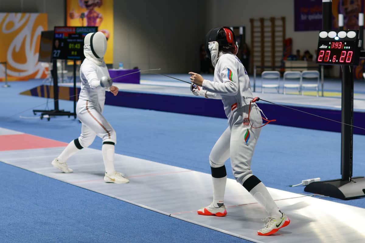 III MDB oyunlarında Gəncə idman sarayında qılıncoynatma yarışı davam edir.